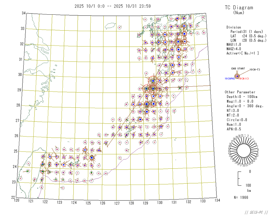 SEIS-PCに対象期間の地震活動状況をエリア分けした円グラフで示すことのできる「TC図」という機能