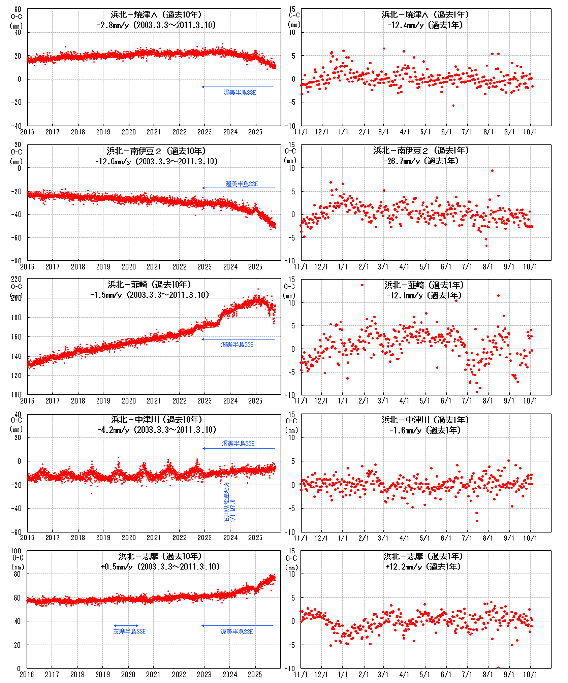 ・浜北基線で1月上旬から西側との伸張・東側との短縮傾向の変動 2025年2月8日時点 3月15日時点 3月22日時点 10月4日時点・基線マップ